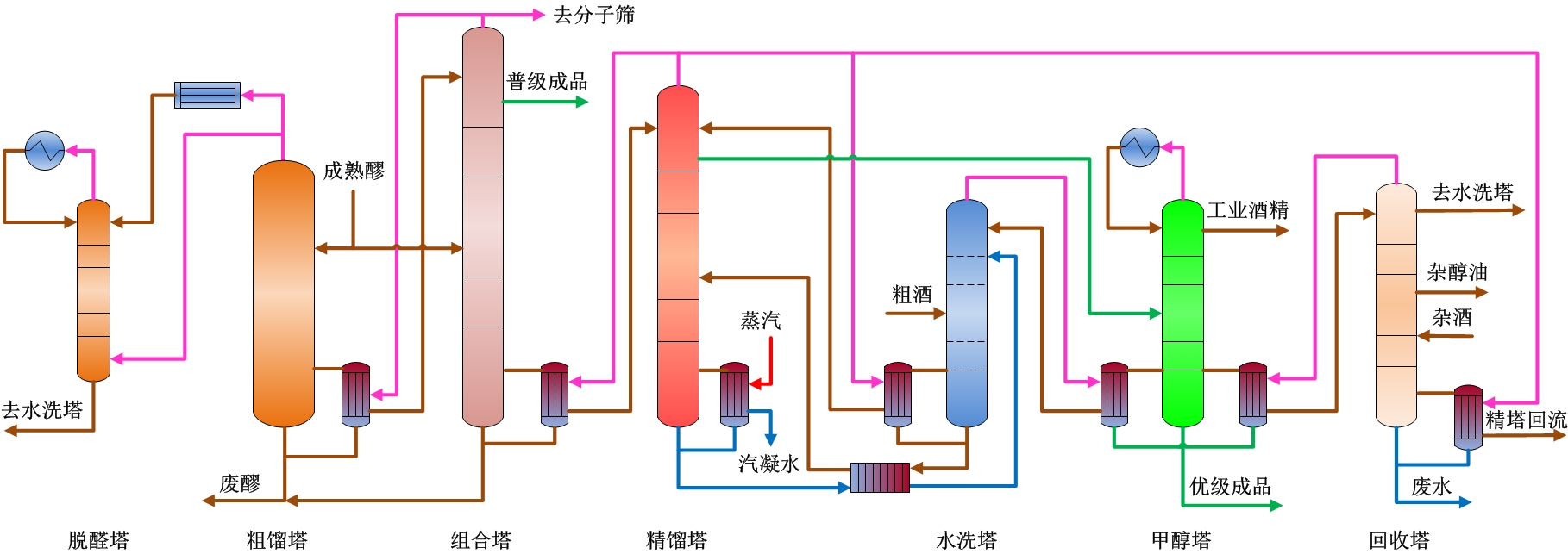 本工藝技術(shù)把最先進的中科天元專有的ZKTY®G5D2①“雙粗塔差壓蒸餾技術(shù)”及“五塔差壓蒸餾技術(shù)”緊密地結(jié)合了起來,形成了新一代具有自主知識產(chǎn)權(quán)的七塔多效差壓蒸餾技術(shù),配置粗塔、脫醛塔、組合塔、水洗塔、精餾塔、甲醇塔、回收塔,基于“精塔一塔供熱”,精塔頂酒汽供熱組合塔、回收塔和水洗塔,組合塔頂酒汽供熱粗塔,水洗塔和回收塔頂酒汽供熱甲醇塔的熱量耦合方案,其它熱源作為醪液多梯次預(yù)熱,沸點進料,生產(chǎn)優(yōu)級和普級食用酒精。如果與分子篩系統(tǒng)配套,也可以調(diào)整為生產(chǎn)燃料乙醇與優(yōu)級食用酒精。噸酒汽耗小于1.5噸蒸汽。